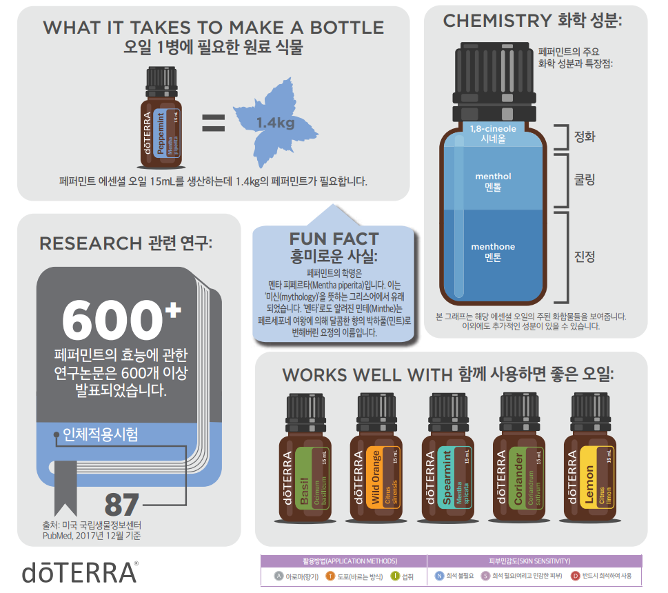페퍼민트는 멘톨의 함량이 그 품질을 좌우합니다. 상쾌한 향과 무수히 많은 특장점을 갖고 있어 베스트 셀러 제품 중 하나인 도테라의 100% 천연 페퍼민트 에센셜 오일은 최고 품질의 박하 품종을 사용하여 멘톨의 함량이 매우 높고 풍부하게 함유되어 있습니다.