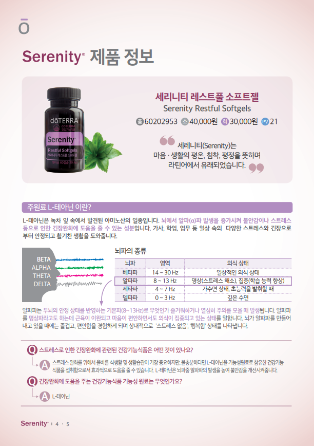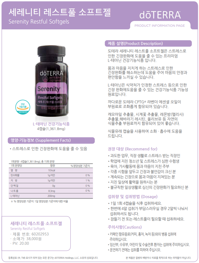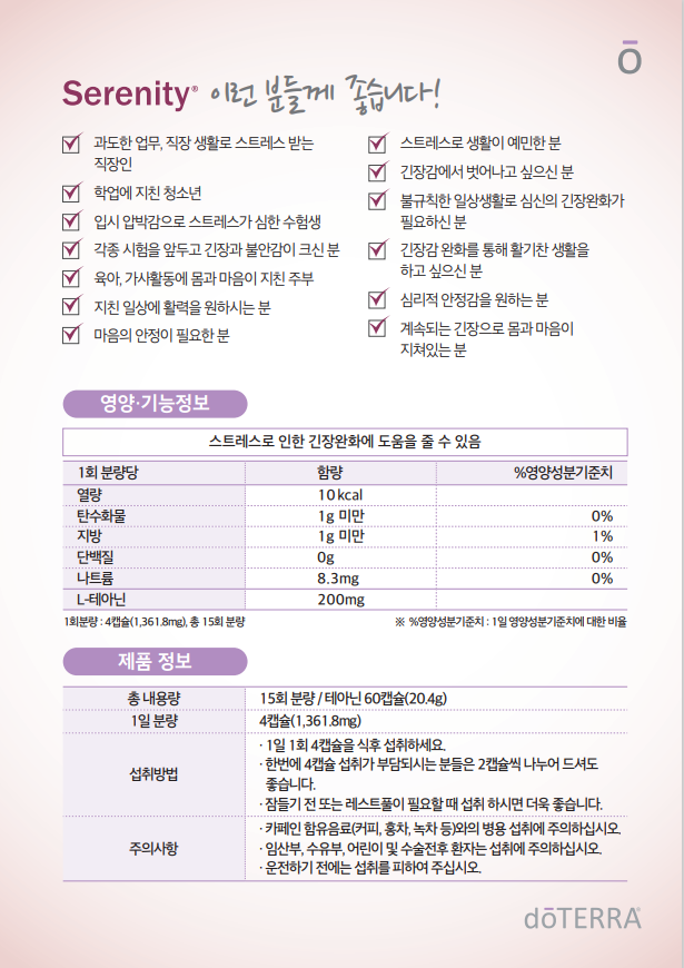 도테라 세레니티 레스트풀 소프트젤은 스트레스로 인한 긴장완화에 도움을 줄 수 있는 프리미엄 L-테아닌 건강기능식품 입니다.