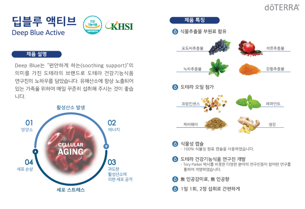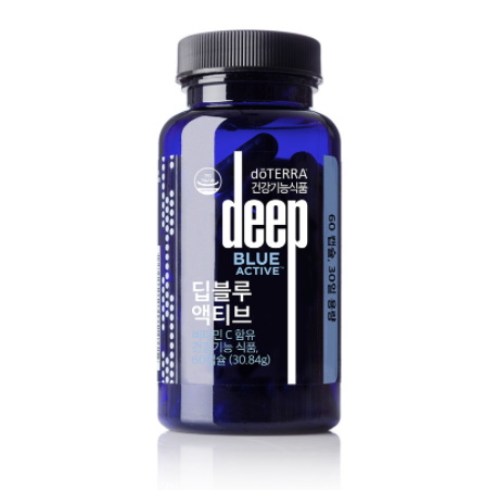 Deep Blue’는 ‘편안하게 하는 (Soothing Support)’이라는 뜻을 가진 도테라 고유의 브랜드로 도테라 전문 연구진의 특별한 노하우를 담고 있습니다.도테라 딥블루 액티브는 유해산소에 항상 노출되어 있는 모든 분들께 꼭 필요한 필수 영양소, 비타민 C를 함유한 건강기능식품입니다. 포도씨 추출물, 석류열매 추출물, 녹차잎 추출물, 강황 추출물 등 다양한 식물 추출물을 부원료로 함유하고 있으며, 도테라의 까다로운 CPTG 기술로 추출한 보스웰리아 프랑킨센스, 캐러웨이, 진저, 페퍼민트 등을 함유하고 있어 더욱 좋습니다.無인공감미료, 無인공향, 100% 식물성 원료 캡슐을 사용하여 더욱 건강하게 섭취하실 수 있습니다.