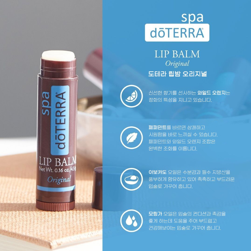 식물성 오일과 식물 추출 성분 그리고 도테라만의 CPTG® 에센셜 오일까지 자연유래 성분으로 구성된 doTERRA® SPA 립밤은 입술을 촉촉하게 가꾸고 진정시키는 효과와 함께 에센셜 오일의 순수한 자연의 향을 담고 있습니다.