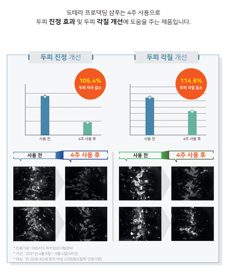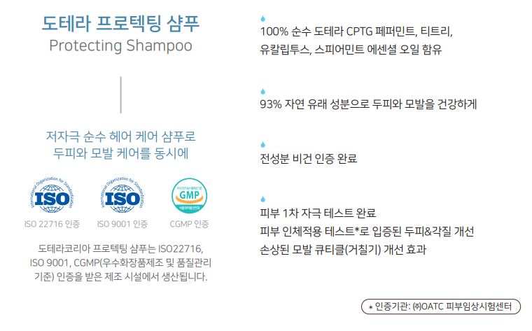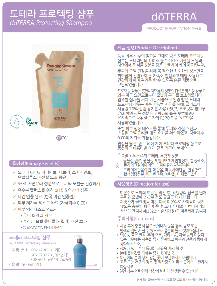 또한 피부 임상 테스트를 통해 두피와 각질 개선과 손상된 모발 큐티클 개선 효과를 확인하였고, 자극지수 0.00의 저자극 제품입니다. 진심을 담은 순수 헤어 케어 도테라 프로텍팅 샴푸로 풍성하고 아름다운 머리 결을 가꾸어 보세요.