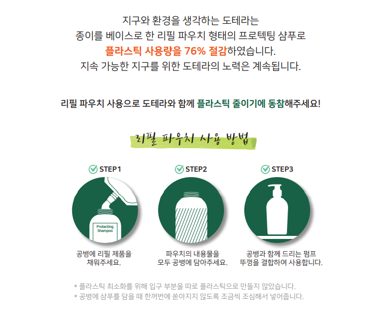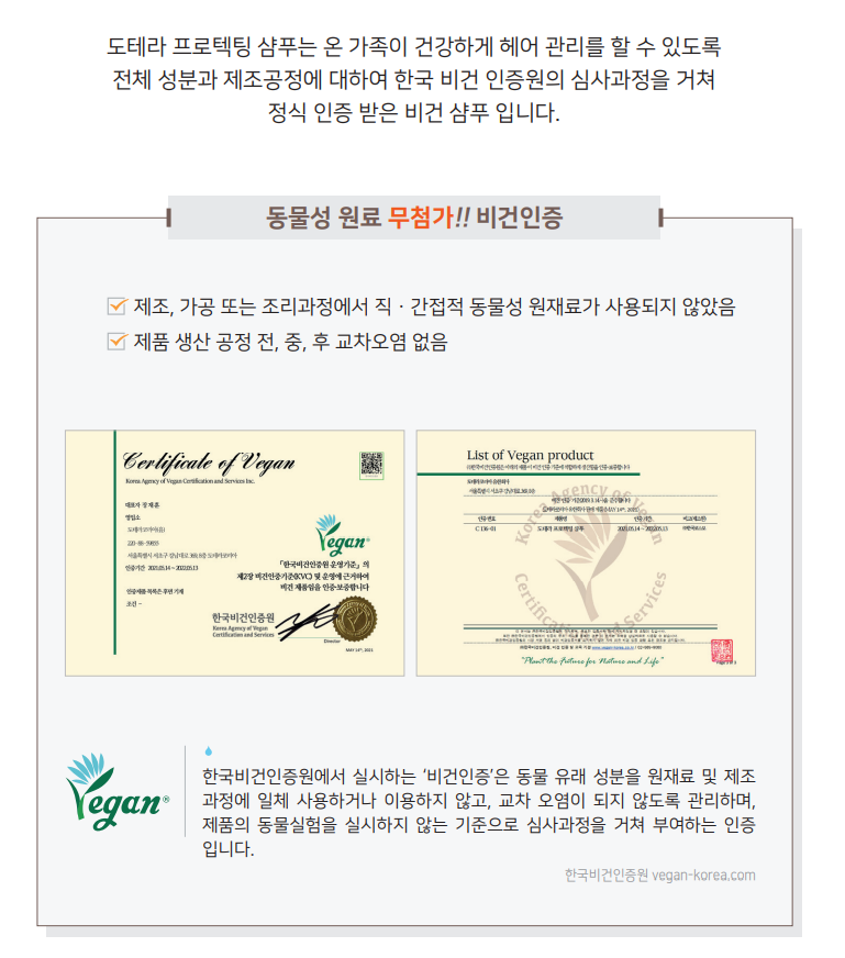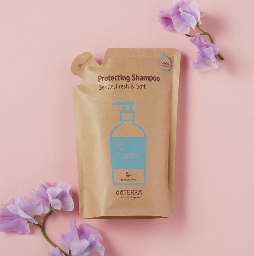 엄격한 심사를 거쳐 비건 제품으로 인증 받은 도테라 프로텍팅 샴푸는 지속 가능한 지구를 위해, 플라스틱 사용량 76% 절감 용기를 사용하였고, 코코넛과 팜나무 유래 천연 식물 성분은 고릴라와 숲을 보호하면서 윤리적으로 채취한 고가의 RSPO 인증 원료만을 사용하였습니다.