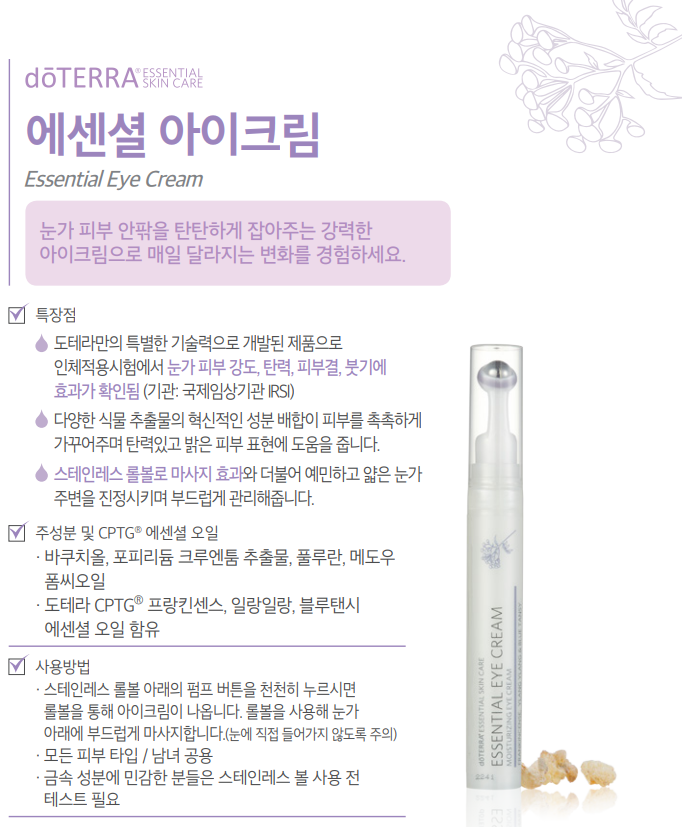 새롭게 선보이는 도테라 아이크림은 고순도의 프랑킨센스, 일랑일랑꽃, 블루탠지 CPTG® 에센셜 오일을 함유하고 있어, 연약한 눈가 주변 피부의 집중적인 관리에 효과적입니다. 다양한 식물 추출물의 혁신적인 성분 배합이 피부를 촉촉하게 가꾸어주며 탄력 있고 밝은 피부 표현에 도움을 줍니다.