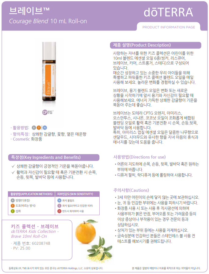 브레이브, 용기 블렌드 오일은 변화 또는 새로운 상황을 시작하기에 앞서 용기와 자신감이 필요할 때 사용해보세요. 에너지 가득한 상쾌한 감귤향이 기운을 북돋아 주는데 좋습니다.