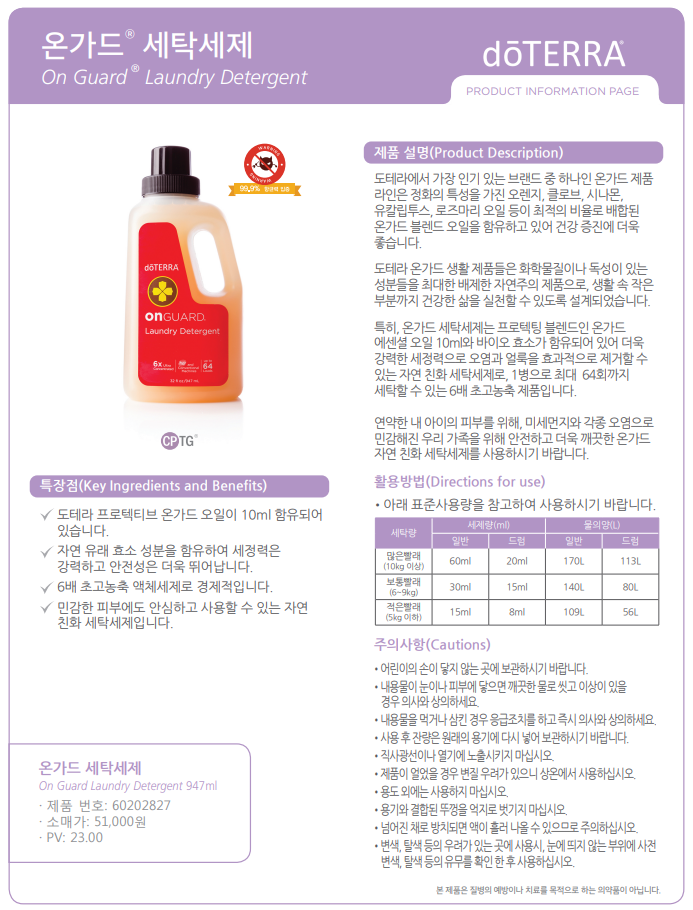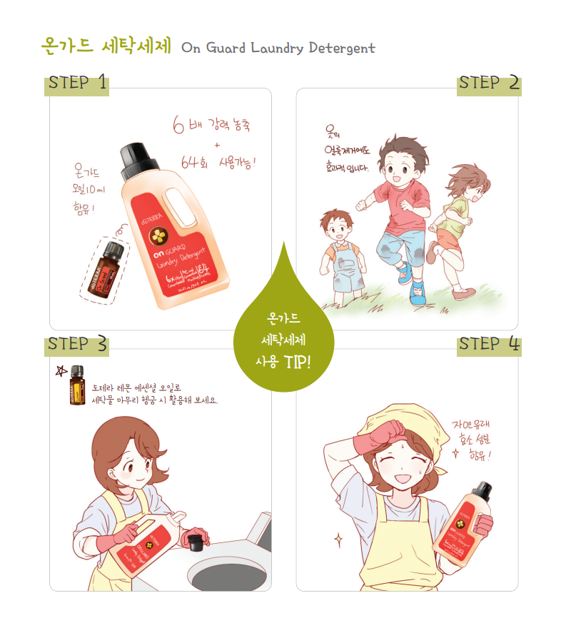 특히, 온가드 세탁세제는 프로텍팅 블렌드인 온가드 에센셜 오일 10ml와 바이오 효소가 함유되어 있어 더욱 강력한 세정력으로 오염과 얼룩을 효과적으로 제거할 수 있는 자연 친화 세탁세제로, 1병으로 최대 64회까지 세탁할 수 있는 6배 초고농축 제품입니다.