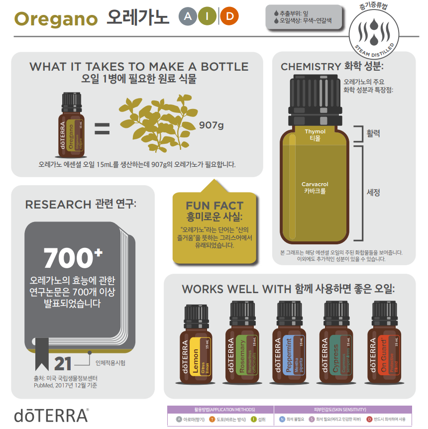 오레가노의 주요 화학 성분은 페놀 성분인 카르바크롤과 티몰입니다. 페놀 함량이 높기 때문에 오레가노의 향을 직접 맡을 경우에는 1방울 정도 소량을 주의해서 사용 해야합니다.