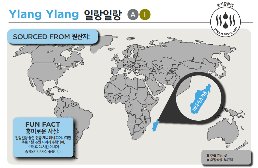 ‘꽃 중의 꽃’이라는 의미의 일랑일랑 오일은 열대 일랑일랑 나무에서 피는 별 모양의 꽃에서 추출하며, 상큼한 재스민 향이 납니다.