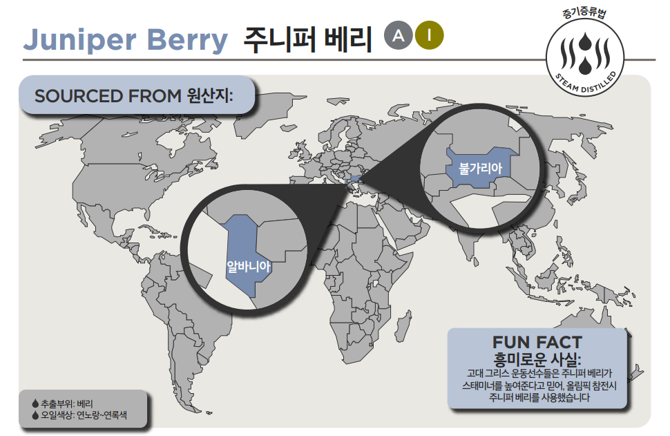 주니퍼 베리의 신선한 나무 향은 침착하고 차분한 느낌을 선사해줍니다.