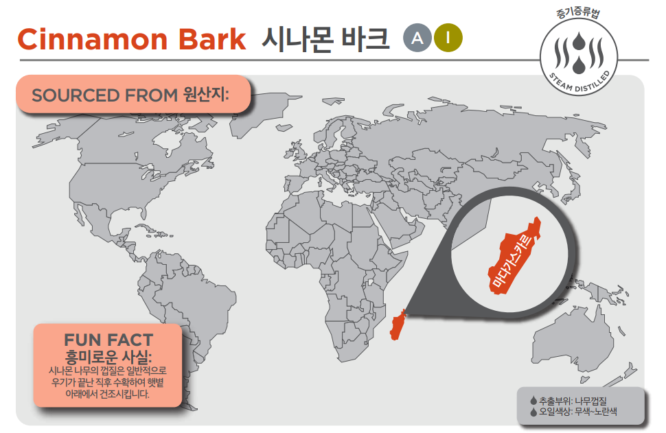 시나몬 바크 에센셜 오일은 신남알데하이드 함량이 높은 강한 성질을 지니고 있습니다. 또한 계피는 예로부터 구강과 잇몸 청결을 위하여 자주 사용되어 왔습니다.