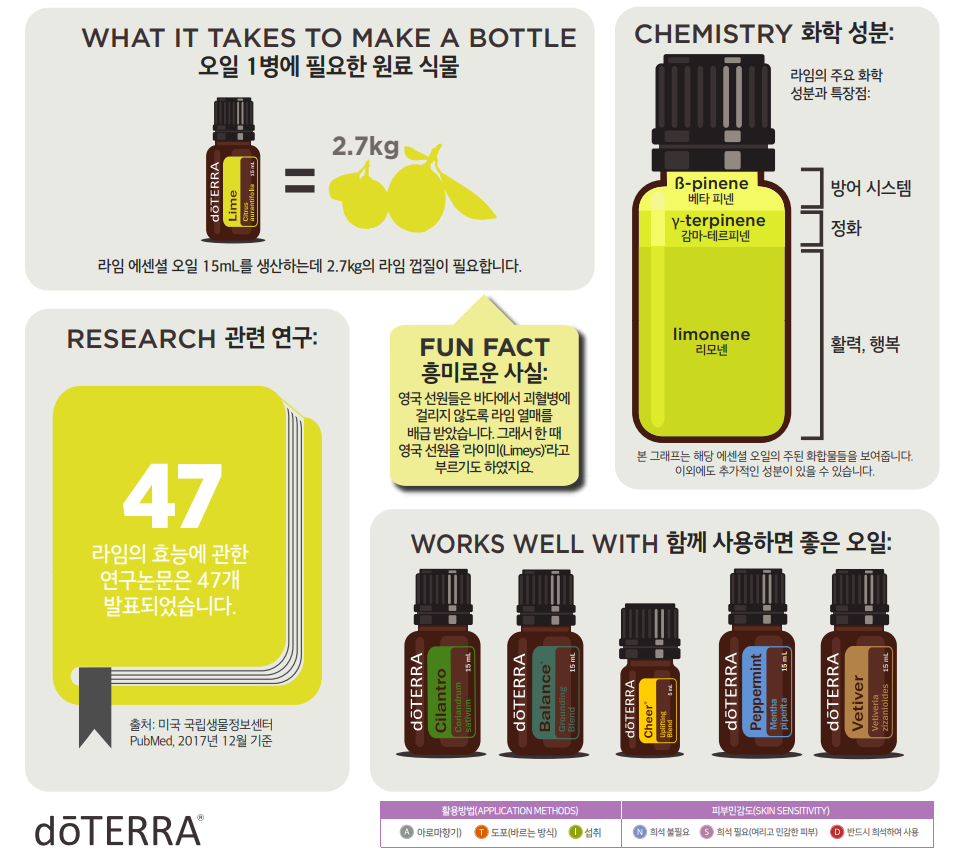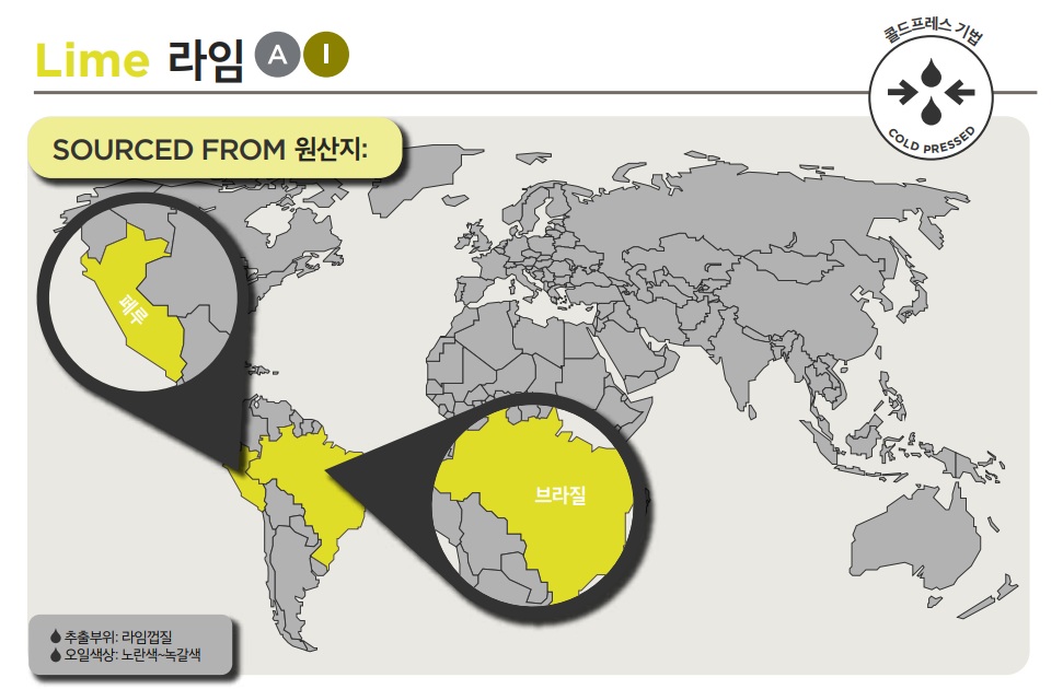 신맛과 새콤달콤한 맛이 어우러지는 라임은 구연산과 비타민 C가 풍부하고 특유의 상큼한 시트러스 향을