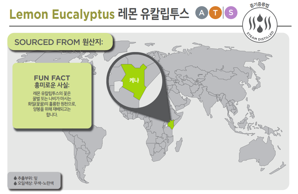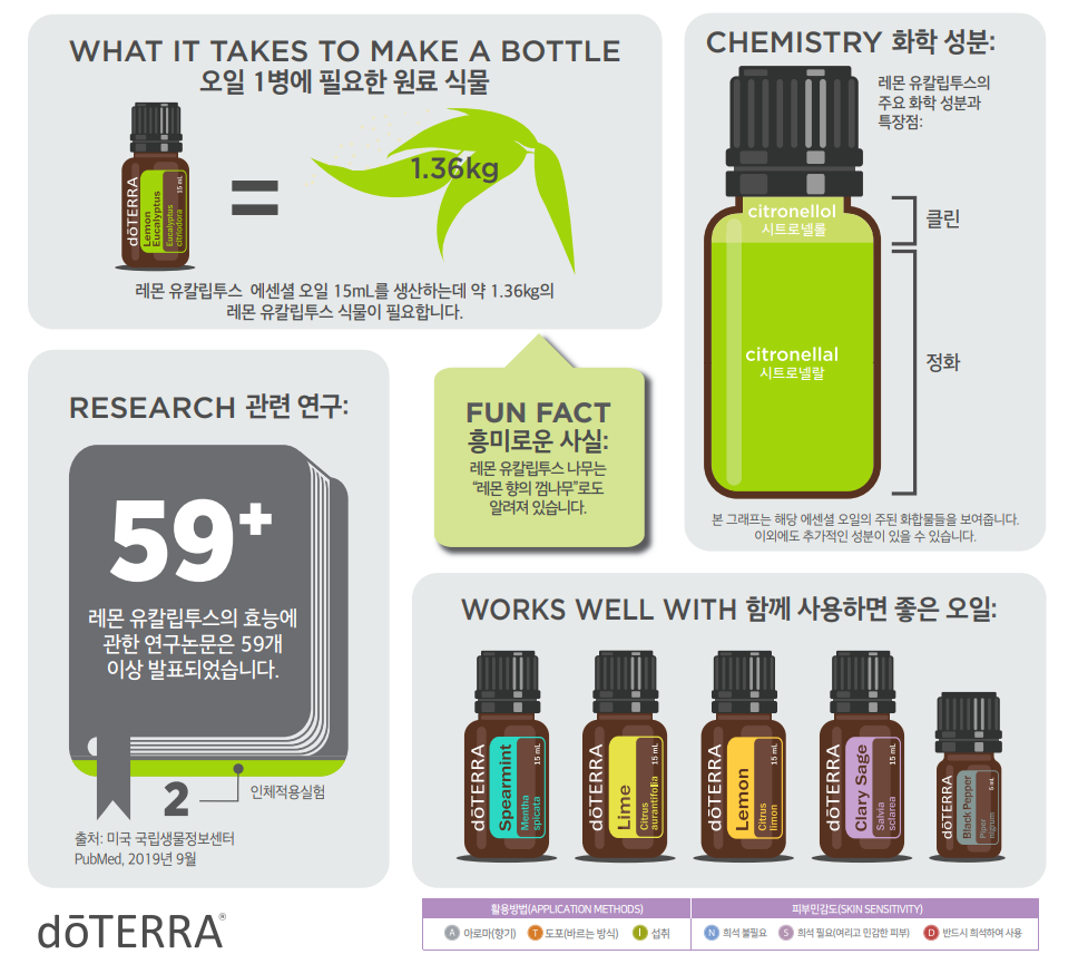 레몬 유칼립투스 에센셜 오일은 호주 북부에 자생하며 부드 러운 껍질과 레몬 향을 지닌 키가 큰 푸른색 껌나무, 유칼립 투스 식물에서 얻어집니다. 이 오일은 활력 가득한 환경을 만드는데 도움을 주는 상쾌하고 신선한 향으로 잘 알려져 있습니다.