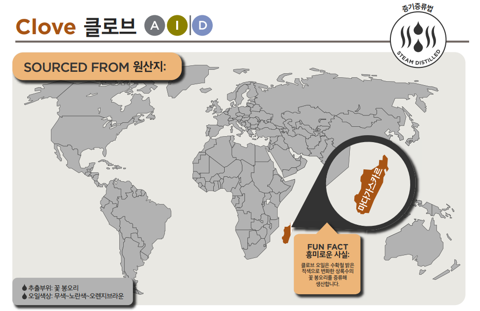 클로브는 인도네시아 모루카 제도가 원산지로 특이하게 꽃봉오리에서 추출되는 오일입니다. 키는 10m 가량으로 잎은 타원형이며 끝이 뾰족하고 마주 납니다. 엷은 자주빛 네잎꽃이 가지 끝에 두서 너개가 모여서 피는데, 향기가 좋고 열매는 핵과로 길이 2cm의 타원형이며 씨가 1개씩 들어 있습니다.