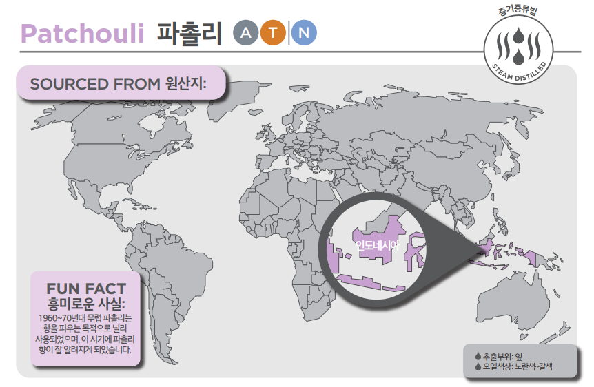 진한 머스크 향으로 잘 알려진 파촐리는 세탁세제, 탈취제 및 공기청정제 뿐만아니라 향수에도 자주 사용되는 원재료 입니다.