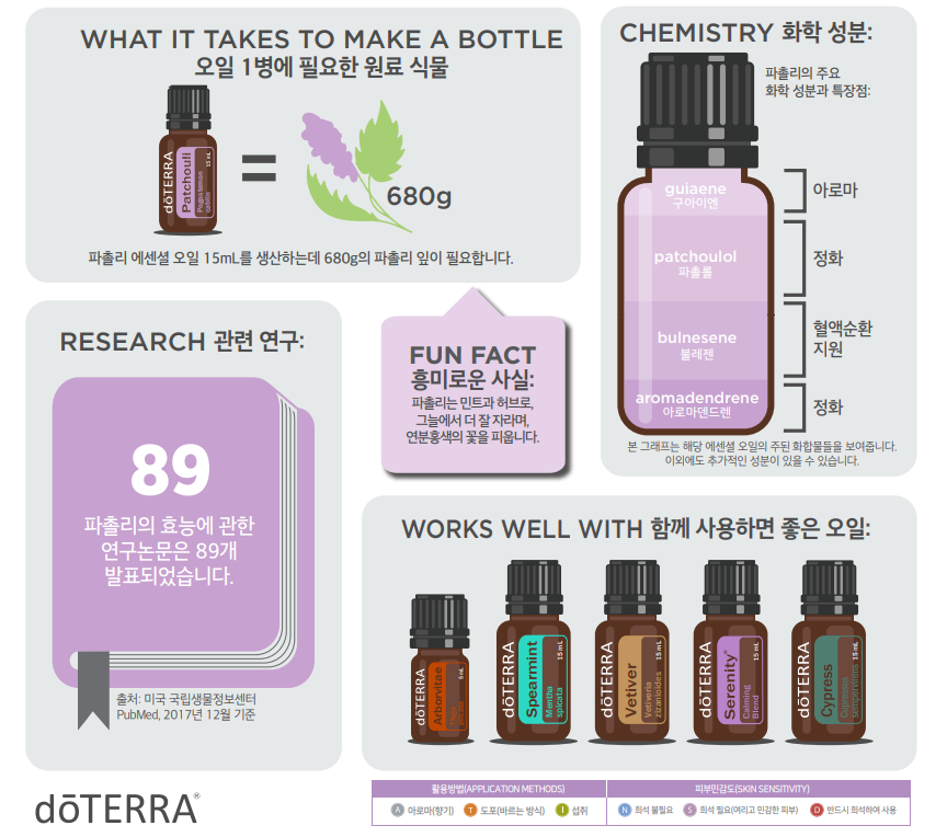 피부 진정에 효과적인 도테라 파촐리 에센셜 오일은 로션이나 크림에 섞어 사용하면 피부 활력과 탄력에 도움을 주어 빛나고 어린 피부결로 가꾸어 줍니다.