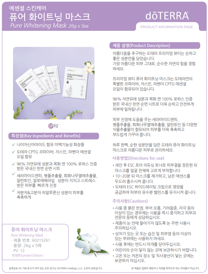 프리미엄 뷰티 퓨어 화이트닝 마스크는 도테라만의 특별한 코파이바, 자스민, 라벤더 CPTG 에센셜 오일이 함유되어 있습니다.